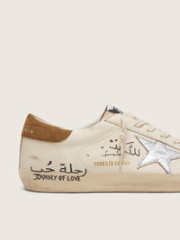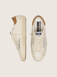 A timeless icon yet one that’s constantly evolving. At Golden, we love taking our classics and reworking them all the time, always from a new angle. These men’s Super-Star sneakers with a white nappa leather upper feature a metallic silver star and a tobacco suede heel tab. The all-over black lettering and the cream laces add the finishing touch. DETAILS Item No. GMF00101.F007131.10224 - White nappa leather upper - Metallic silver leather star - Tobacco-colored suede heel tab - Cream-colored laces - All-over black lettering - Upper: 93% sheepskin leather, 4% cow leather, 3% goatskin leather - Lining: 41% cotton, 31% cow leather, 17% textile polyurethane, 7% polyester, 4% viscose - Sole: 100% rubber - Handmade - Made in Italy