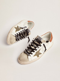A timeless icon yet one that’s constantly evolving. At Golden, we love taking our classics and reworking them all the time, always from a new angle. This white leather model features an olive-green canvas star, tan leather heel tab and ice-gray suede tongue. And the black laces with contrasting logo add a stylish finishing touch. DETAILS Item No. GMF00101.F002709.10947 - Color: white - Olive-green canvas star - Tan leather heel tab - Ice-gray suede tongue - Black laces with contrasting logo - Vintage finish - Upper: 97% cow leather, 3% cotton - Lining: 60% cow leather, 40% cotton - Sole: 100% rubber - Handcrafted - Made in Italy
