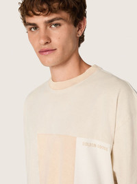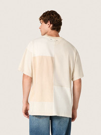 Our Holiday Collection is a celebration of woven textures and sharp tailoring, blending with soft knits, velvet whispers, archive florals, and satin that catches the light just right. Crafted from marbled-effect cotton jersey in white and beige, this men's T-shirt features a loose fit and a colorblock patchwork design. The Golden Goose logo embroidered on the chest and the double star on the back complete the look. DETAILS Item No. GMP01535.P002365.12389 - Journey Collection - Color: white and beige tones - Men's model - Loose fit - Patchwork design with colorblock effect - Golden Goose logo embroidered on the chest - Main material: 100% cotton - Hem: 100% cotton - Decorative yarn: 100% polyester - Made in Italy The model is 185 cm tall and is wearing a size M.