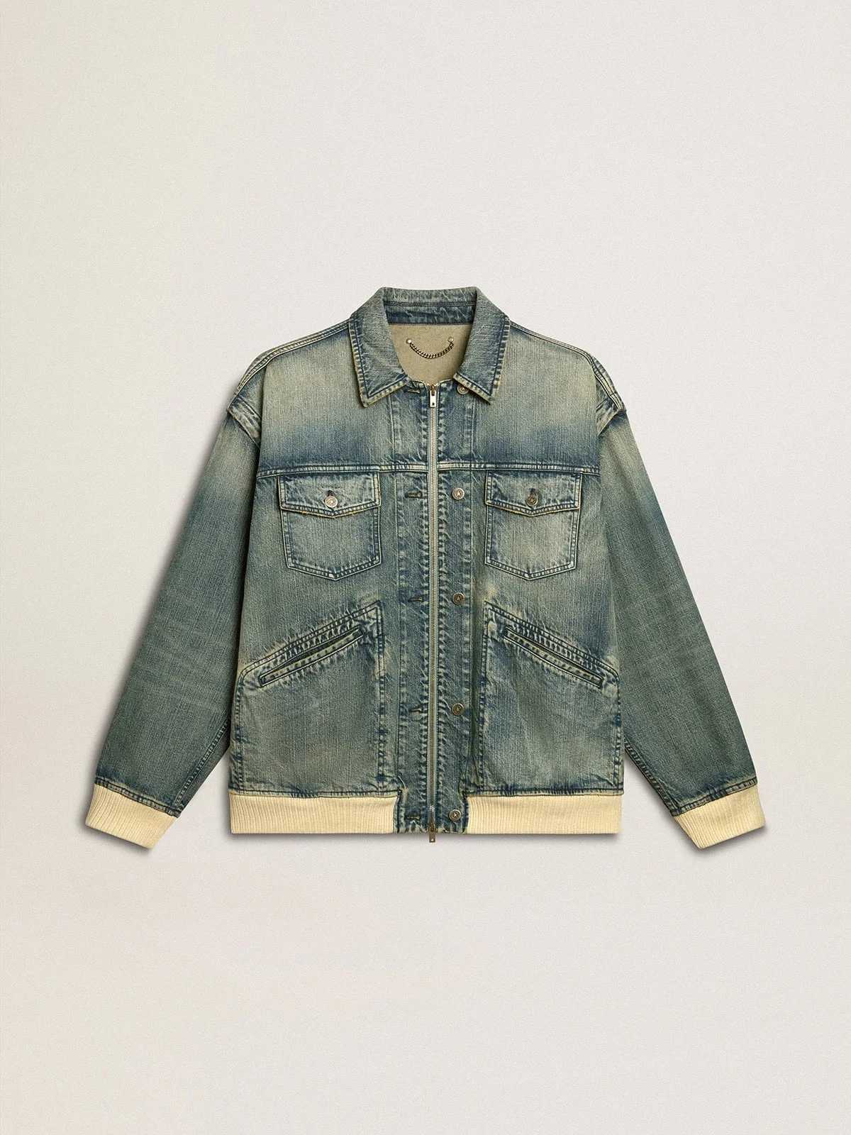 A collection inspired by the harmony of nature, where every detail flows with ease. With an oversized fit, this sand-colored washed-denim jacket features wool-blend ribbing and four front pockets. The removable sleeves and full zip closure add the finishing touch. DETAILS Item No. GMP02125.P001853.50100 - Journey Collection - Color: blue - Double star on the back - Oversized fit - Washed effect - Four pockets - Removable zip-on sleeves - Full zip fastening - Main material: 100% cotton - Rib material: 42% wool, 42% acrylic, 14% polyester, 2% spandex - Pocket lining: 65% polyester, 35% cotton - Made in Italy The model is 183 cm tall and is wearing a size 48.
