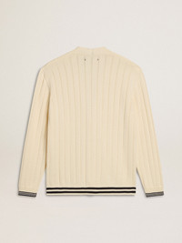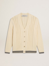 Inspired by the electric energy of the Nineties, the collection celebrates the limitless power of shared dreams. Moved by passion, each design captures the meaning of togetherness and the power of music. In worn-white cotton, this men's cardigan features a cable pattern on the front and dark blue striped ribbing on the hem and sleeves. DETAILS Item No. GMP02118.P001911.11782 - Journey Collection - Color: worn white - Double star on the back - Five-button closure - Dark blue striped ribbing on the hem and at the end of the sleeves - Cable pattern - Main material: 100% cotton - Rib material: 100% cotton - Made in Italy The model is 183 cm tall and is wearing a size M.