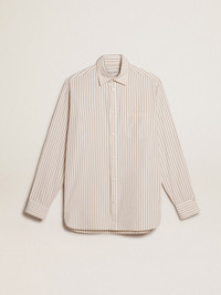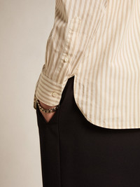 An ode to Venice, our home, seen with the eyes of those dreamers who live it every day. This Journey Collection explores the city of our roots, drawing inspiration from the people who inhabit it. Different, iconic places now discovered through the life of its lovers. This men’s white cotton poplin shirt features travertine-beige stripes. DETAILS Item No. GMP00246.P001168.82335 - Journey Collection - Color: white - Travertine-beige stripes - Double star on the back - Regular fit - Mother-of-pearl buttons - Main material: 100% cotton - Made in Italy The model is 183 cm tall and is wearing a size M.
