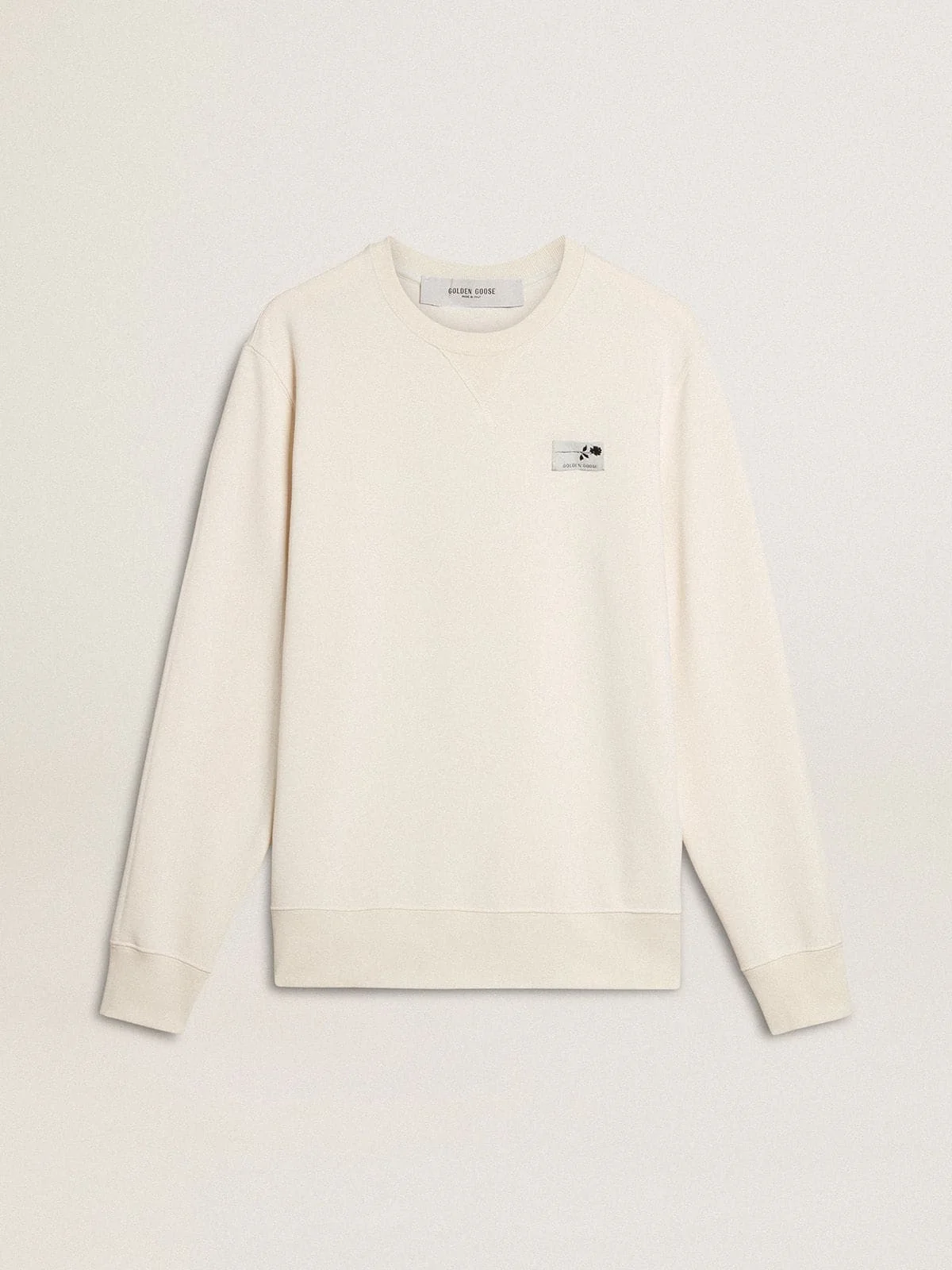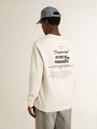 The second drop in the Fall/Winter 25 collection unfolds like a relaxed and refreshing journey, woven into the fabric of each and every piece. Made of white organic cotton, this men's sweatshirt features a branded label on the chest and black lettering on the back. The micro-ribbed hems and two little stars on the back add the finishing touch. DETAILS Item No. GMP01223.P002139.82432 - Journey Collection - Color: white - Branded label on the chest - Writing printed on the back in black - Micro-ribbed trims - Double gold star on the back - Main material: 100% cotton - Made in Italy The model is 183 cm tall and is wearing a size M.