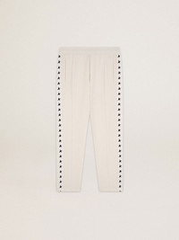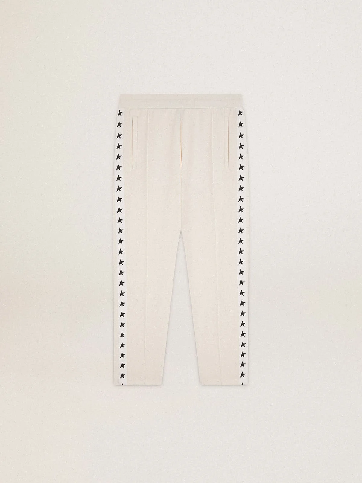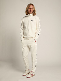 A collection with a casual soul but a versatile attitude: inspired by the Seventies, it has a timeless vintage appeal, suited to any occasion or look. Inspired by the world of tailoring, echoed by the stitched pleat on the front, these joggers in papyrus-white technical jersey feature a wide leg. The tone-on-tone grosgrain strip on the sides of the legs with contrasting black stars adds the finishing touch. DETAILS Item No. GMP00877.P000521.81347 - Star Collection - Color: papyrus white - Wide leg - Three pockets - White grosgrain strip on the sides with contrasting black stars - Main material: 100% polyester - Pocket lining: 100% cotton - Made in Italy The model is 183 cm tall and is wearing a size M.