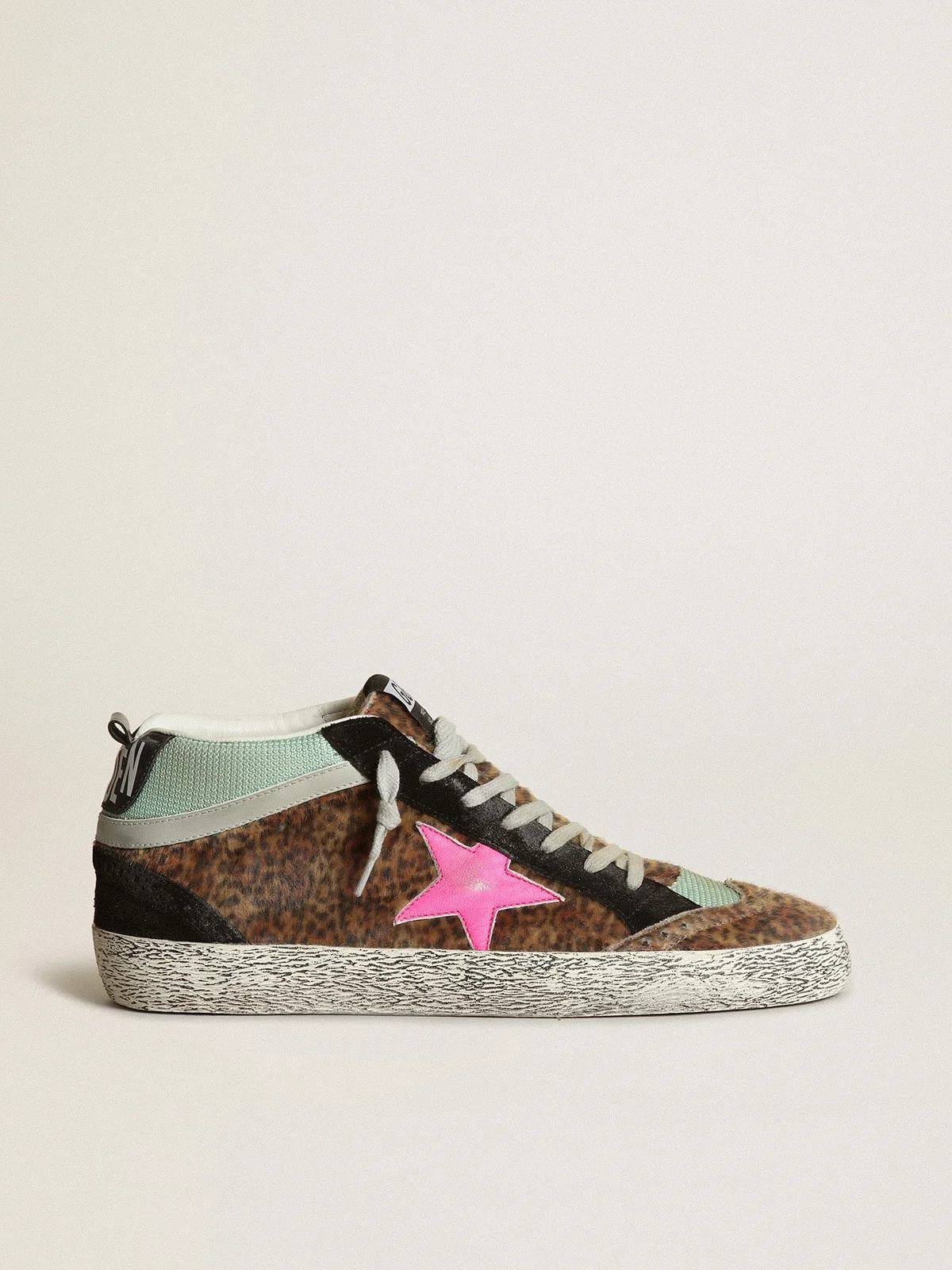Uniquely elegant versatility: the Mid Star sneakers take a refined approach to their Eighties skate scene inspiration. With a leopard-print pony skin upper accentuated by aquamarine mesh inserts, this version features a fuchsia leather star, a black leather heel tab and inserts in black suede. The ice-gray laces and leather flash complete the look. DETAILS Item No. GMF00123.F003127.81750 - Leopard-print pony skin upper - Fuchsia leather star - Black leather heel tab - Aquamarine mesh inserts - Ice-gray leather flash - Black suede inserts - Broguing details - Ice-gray laces - Vintage finish - Upper: 51% polyester, 29% cow leather, 13% polyamide, 5% sheepskin leather, 2% cotton - Lining: 60% cotton, 40% cow leather - Sole: 100% rubber