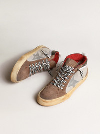 Uniquely elegant versatility: the Mid Star sneakers take a refined approach to their Eighties skate scene inspiration. With a light silver mesh and brown suede upper accentuated with glossy black leather inserts, this model features a silver leather star and a white grosgrain flash. The ripstop cotton heel tab in brown camouflage print and the black and white checkered laces complete the look. DETAILS Item No. GMF00123.F003985.81995 - Light silver mesh and brown suede upper - Silver leather star - Ripstop cotton heel tab in brown camouflage print - White grosgrain flash - Glossy black leather inserts - Broguing detail - Black and white checkered laces - Vintage finish - Upper: 61% cow leather, 30% polyester, 6% viscose, 3% cotton - Lining: 22% cow leather, 56% cotton, 19% polyester, 3% textile polyurethane - Sole: 100% rubber - Handmade - Made in Italy