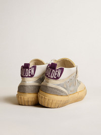 Uniquely elegant versatility: the Mid Star sneakers take a refined approach to their Nineties skate scene inspiration. These LAB sneakers with a silver metallic leather upper with white mesh insert feature a tone-on-tone perforated star, a purple suede heel tab, and inserts in ice-gray suede with broguing. The nude cotton flash, beige foam rubber tongue and white laces complete the look. DETAILS Item No. GMF00507.F004361.70270 - Silver metallic leather upper - Tone-on-tone perforated star - Purple suede heel tab - White mesh insert - Nude cotton flash - Ice-gray suede inserts with broguing - Beige foam rubber tongue - Nude leather insert - Nude grosgrain trim - White laces - Textured-effect beige foxing - Vintage finish - Upper: 42% sheepskin leather, 32% cow leather, 13% polyurethane, 7% polyester, 6% cotton - Lining: 55% cotton, 37% cow leather, 5% polyester, 3% polyurethane - Sole: 100% rubber - Handmade - Made in Italy