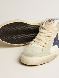 Uniquely elegant versatility: the Mid Star sneakers take a refined approach to their Nineties skate scene inspiration. With a white leather upper accentuated by ice-gray suede inserts, this model features a blue leather star and a white nappa leather flash. The red leather heel tab, white crackle leather insert on the ankle and cream-colored laces complete the look. DETAILS Item No. GMF00123.F005183.82504 - Color: white - Blue leather star - Red leather heel tab - White nappa leather flash - Ice-gray suede inserts - Inserts with broguing - White crackle leather insert on the ankle - Cream-colored laces - Vintage finish - Upper: 97% cow leather, 3% sheepskin leather - Lining: 55% cotton, 23% cow leather, 18% polyester, 4% polyurethane - Sole: 100% rubber - Handmade - Made in Italy
