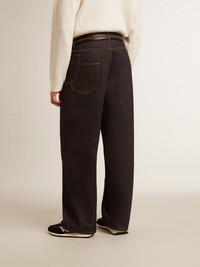 A love story to our home, Marghera. Where everything began. Our latest collection reflects the spirit of our birthplace, its contrasts, industrial soul, and manufacturing landscapes, weaving together inspirations from both the vibrant energy of workwear and the refined essence of traditional tailoring. With a wide fit, these dark blue one-wash denim jeans feature a resin treatment on both the fabric and the final garment which reduces the color solidity. The six pockets add the finishing touch. DETAILS Item No. GMP01943.P001681.50486 - Journey Collection - Color: dark blue - Double star on the back - Wide leg - Six pockets - Main material: 100% cotton - Pocket lining: 65% polyester, 35% cotton - Made in Italy The model is 183 cm tall and is wearing a size 32(IT).