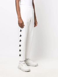 star print track pants A signature to the brand, the star motif is a recurring motif on Golden Goose's designs. Crafted from soft cotton with a tapered leg cut, these white track pants boast the iconic star print in contrasting black. Made in Italy Composition Outer: Cotton 100% Lining: Cotton 100% SIZE & FIT Model measurements Height 6 ft 1 in(1.85 m) Bust/Chest 31.88 in(81 cm) Hips 33.07 in(84 cm) Waist 26.77 in(68 cm) FittingInformation This piece fits true to size. We recommend you get your regular size Cut for a slim fit Made with a mid-weight fabric