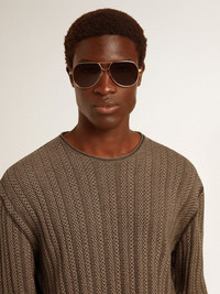 Men's travertine-colored sweater with 'Golden' patch lettering on the back