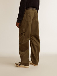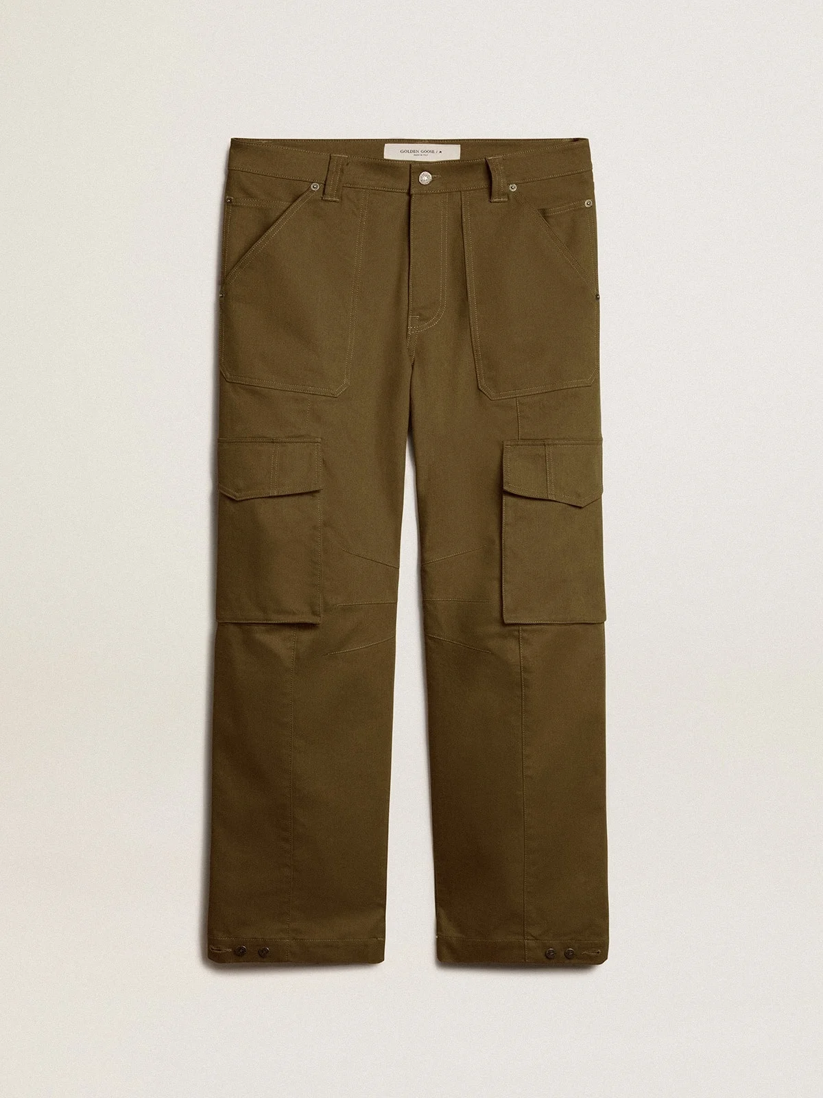 A unique, timeless collection that encapsulates the Golden Goose DNA, designed to remain with you every day, through thick and thin, come rain or shine. These olive-green cargo pants feature a wide leg, six front pockets and two back pockets. DETAILS Item No. GMP01868.P001558.35548 - Golden Collection - Color: olive green - Double gold star on the back - Eight pockets - Wide leg - Main material: 40% elastane, 40% cotton, 20% polyester The model is 183 cm tall and is wearing a size 48.