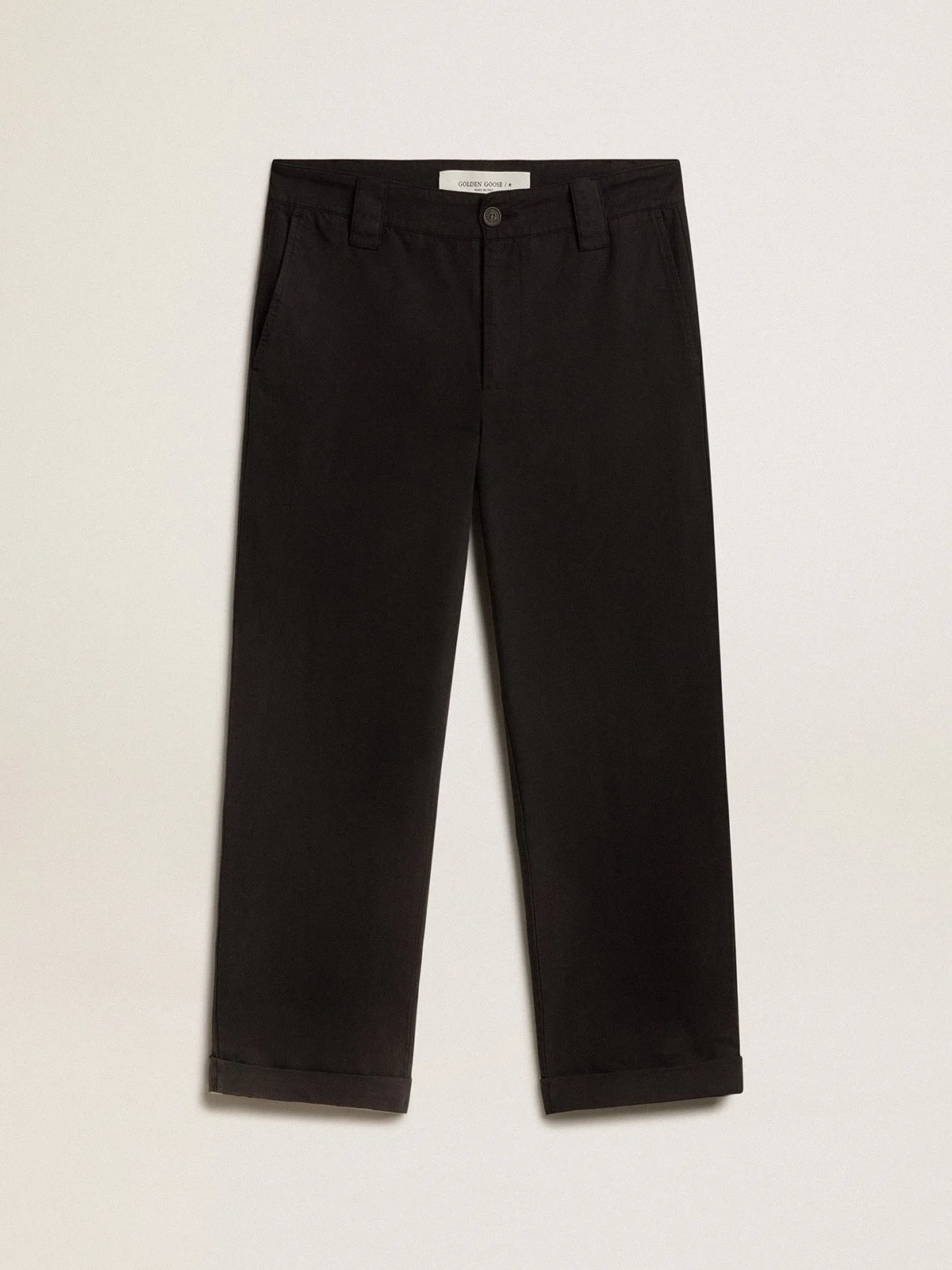 A unique, timeless collection that encapsulates the Golden Goose DNA, designed to remain with you every day, through thick and thin, come rain or shine. These black cotton chinos feature a straight leg and two front pockets. The detachable white patch with a finely embroidered letter G in red adds the finishing touch. DETAILS Item No. GMP01190.P000786.90100 - Golden Collection - Color: black - Double gold star on the back - Detachable white patch with embroidered red letter G - Straight leg - Two pockets - Main material: 40% elastomultiester, 40% cotton, 20% polyester - Pocket lining: 100% cotton - Made in Italy The model is 183 cm tall and is wearing a size 48 (IT).