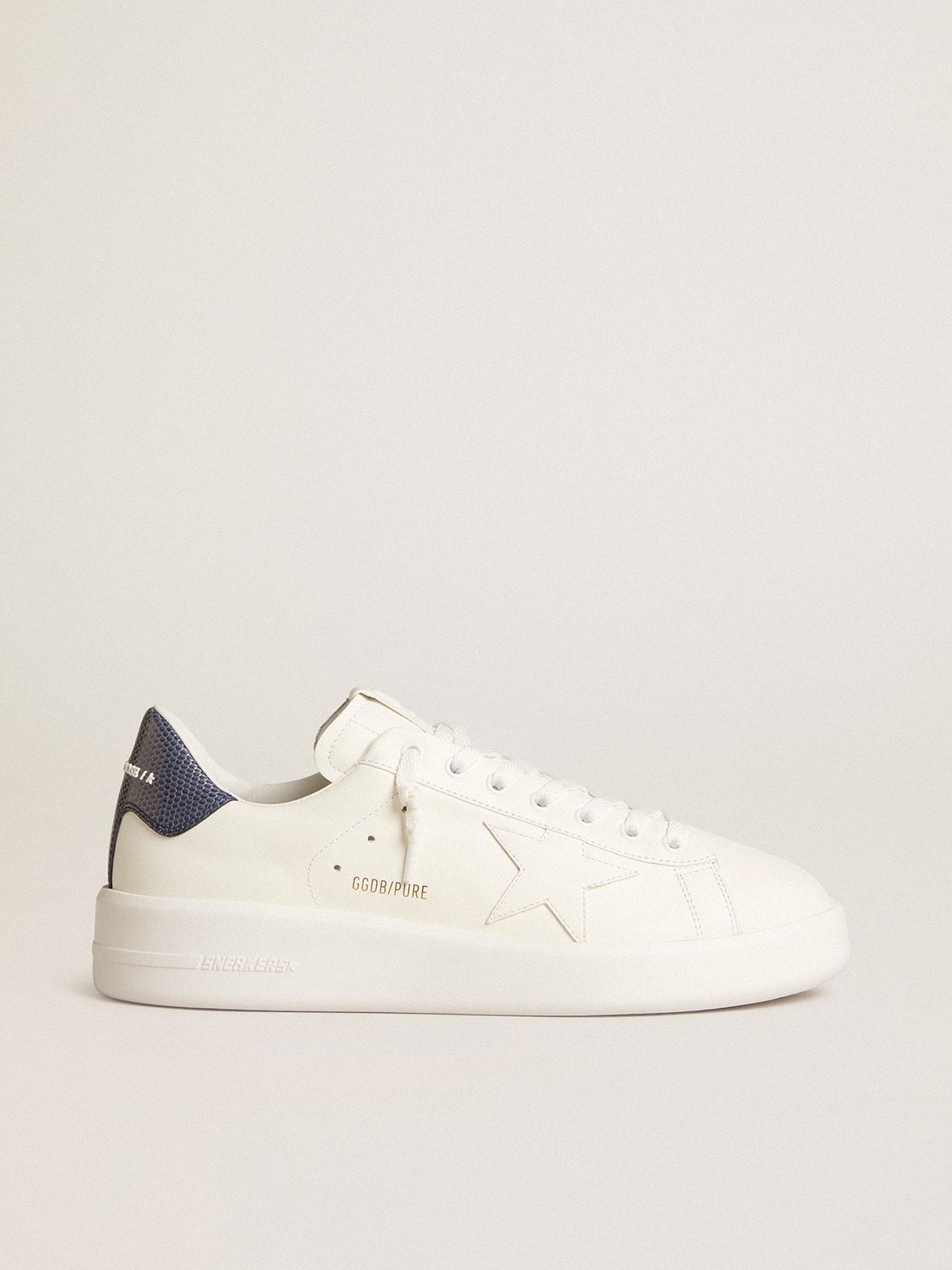 Purestar in leather with white star and blue lizard leather heel tab