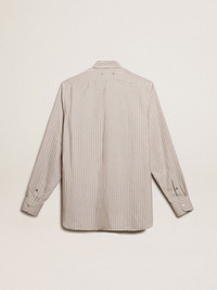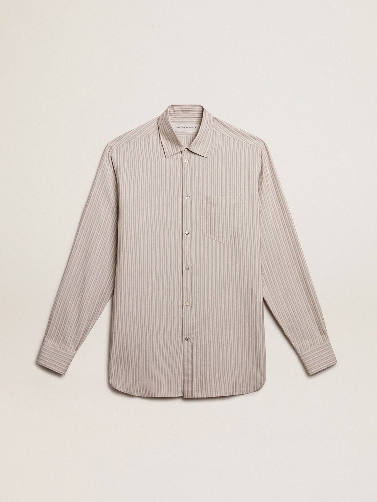 From Venice, our home, to Paris, our dream. This Journey Collection captures the essence and beauty of everyday moments in the City of Lights, immersed in a mesmerizing atmosphere where intimacy, authenticity and curiosity are the pulsating soul of it. This men’s regular-fit shirt made in gray viscose-blend linen features an all-over fine purple striped jacquard motif and a pocket on the front. DETAILS Item No. GMP00246.P001372.60478 - Journey Collection - Color: gray - Regular fit - Double star on the back - Pocket on the front - Fastening with mother-of-pearl buttons - Main material: 50% linen, 50% viscose - Made in Italy The model is 183 cm tall and is wearing a size M.