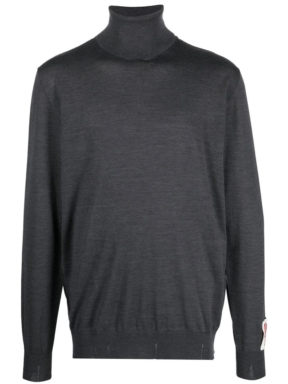 roll neck wool sweater dark grey virgin wool knitted construction roll neck long sleeves ribbed cuffs ribbed hem Made in Italy Composition Virgin Wool 100% SIZE & FIT Model measurements Height 6 ft 2 in(1.88 m) Bust/Chest 35.43 in(90 cm) Hips 36.61 in(93 cm) Waist 27.95 in(71 cm) FittingInformation This piece fits true to size. We recommend you get your regular size Cut for a relaxed fit Made with a mid-weight fabric
