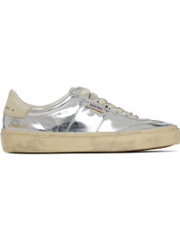 Handcrafted low-top patent leather sneakers in metallic silver tone. · Smudging and subtle distressing throughout · Lace-up closure · Logo embossed at padded tongue · Padded collar · Logo flag and stamp at outer side · Logo printed at buffed leather heel tab · Buffed faux-leather and terrycloth lining · Treaded rubber sole Supplier color: Silver/Cream Upper: leather. Sole: rubber. Made in Italy 251264M237053