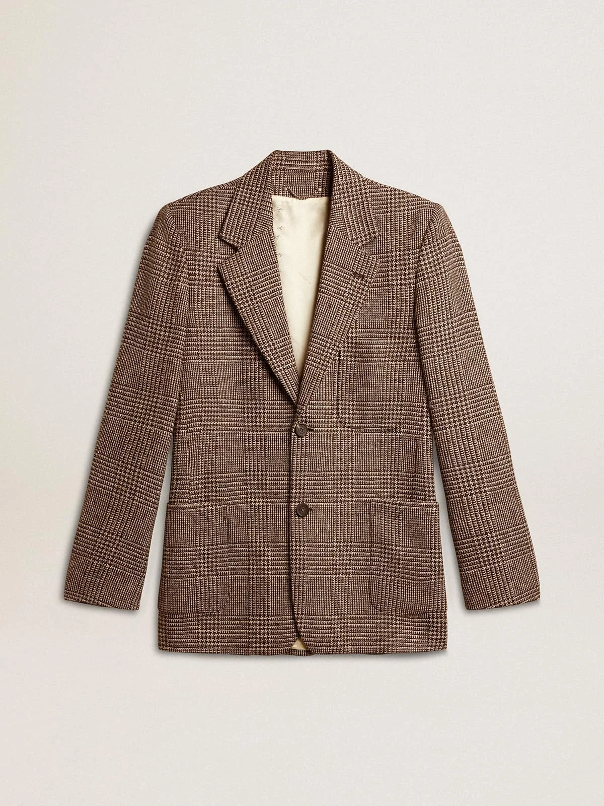 A love story to our home, Marghera. Where everything began. Our latest collection reflects the spirit of our birthplace, its contrasts, industrial soul, and manufacturing landscapes, weaving together inspirations from both the vibrant energy of workwear and the refined essence of traditional tailoring. In a regular fit, this single-breasted blazer features houndstooth wool with gray and brown contrasts. The three pockets on the front and two horn buttons add the finishing touch. DETAILS Item No. GMP01826.P001341.82513 - Journey Collection - Color: gray - Double star on the back - Horn button fastening - Three pockets - Printed lining - Main material: 73% virgin wool, 27% polyamide - Lining material: 100% viscose - Pocket lining: 55% polyester, 45% viscose - Made in Italy The model is 183 cm tall and is wearing a size 44(IT).