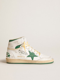 A reinterpretation of high-top sneakers with an authentic soul: inspired by our Ball Star model, our Sky-Star sneakers have an American college vibe and a feel of the basketball scene of the Eighties. This model, with a white leather upper, features a green leather star and heel tab, and the Golden Goose signature on the neck of the ankle, a reference to the childhood dream of having your favorite sneakers signed by basketball legends. The white crackle leather toe, beige nylon tongue and white laces with a yellowed effect complete the look. DETAILS Item No. GMF00230.F005843.10502 - Color: white - Green leather star - Green and white leather heel tab - White crackle leather toe - Beige nylon tongue - Yellowed-effect white laces - Green sole - Vintage finish - Upper: 87% cow leather, 13% polyamide - Lining: 61% cotton, 25% cow leather, 12% polyester, 2% textile polyurethane - Sole: 100% rubber - Handmade - Made in Italy
