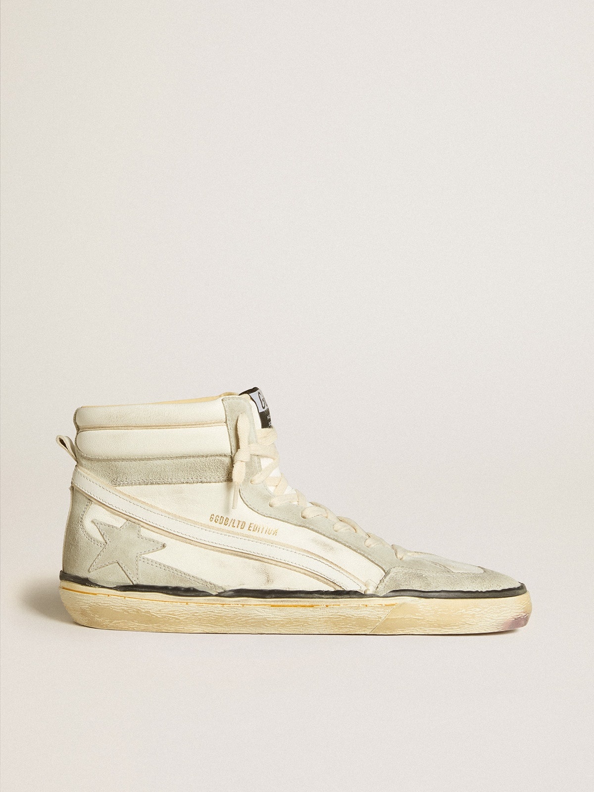 Skate soul, glamorous attitude. Our Slide sneakers take you straight to Venice Beach, between an ollie and a kickflip. With a white nappa leather upper, this model features a gray star and inserts, such as the heel tab and tongue. A white leather flash and cream-colored laces complete the look. DETAILS Item No. GMF00635.F005696.10276 - White nappa leather upper - Gray suede star - Gray suede heel tab - Gray leather tongue - Gray suede inserts - Cream-colored laces - Vintage finish - Upper: 72% sheepskin leather, 28% cow leather - Lining: 35% cow leather, 33% cotton, 15% polyester, 14% polyurethane, 3% viscose - Sole: 100% rubber - Handmade - Made in Italy