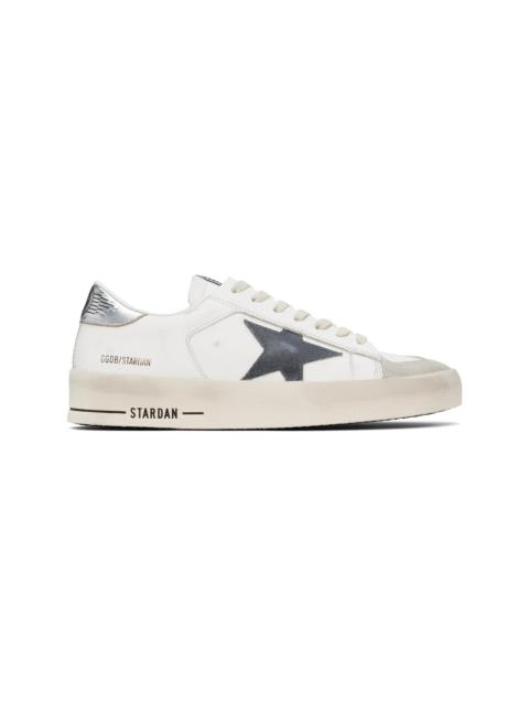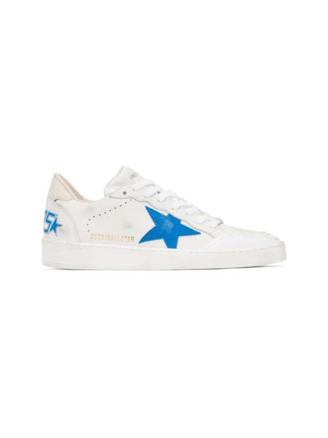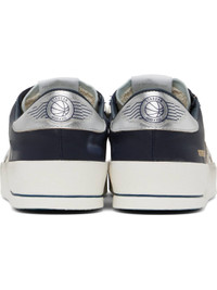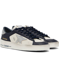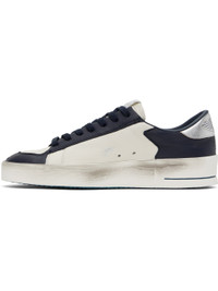Handcrafted low-top nappa leather sneakers in navy and white. · Smudging and patent leather trim throughout · Perforations at toe and inner side · Lace-up closure · Logo patch at padded tongue · Padded collar · Signature star applique at outer side · Logo stamp at outer side · Logo printed at heel tab · Terrycloth, suede, and buffed leather lining · Logo-embossed rubber midsole · Treaded rubber sole Supplier color: Optic white/Navy/Silver Upper: leather. Sole: rubber. Made in Italy 251264M237016