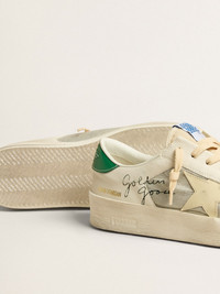 The glorious Nineties wrapped up in a sneaker. The Stardan sneakers pay homage to the basketball icons of that decade, while keeping an eye on the present. This version with a white nappa leather upper with gray ripstop fabric inserts features a cream leather star and a green leather heel tab. The cream nylon tongue and cream-colored laces add the finishing touch. DETAILS Item No. GMF00333.F005258.11683 - White nappa leather and gray ripstop fabric upper - Cream leather star - Green leather heel tab - Cream nylon tongue - Cream laces - Vintage finish - Upper: 59% sheepskin leather, 26% polyamide, 15% cow leather - Lining: 43% cotton, 26% cow leather, 20% textile polyurethane, 6% polyester, 5% viscose - Sole: 100% rubber - Handmade - Made in Italy