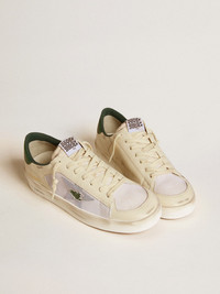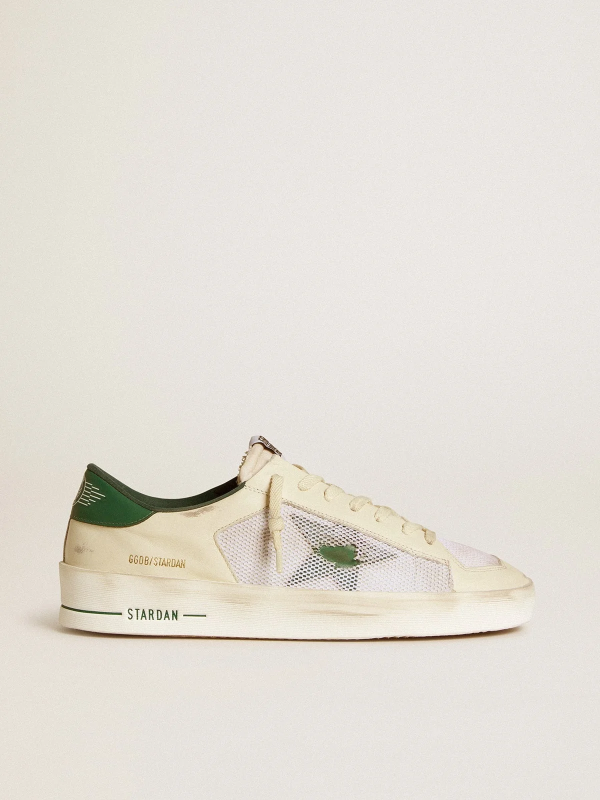 The glorious Nineties wrapped up in a sneaker. The Stardan sneakers pay homage to the basketball icons of that decade, while keeping an eye on the present. This version with a white leather upper with suede inserts and white mesh features a green leather star and heel tab. And cream laces add the finishing touch. DETAILS Item No. GMF00479.F006669.82701 - White leather upper with suede inserts and white mesh - Green leather star - Green leather heel tab - Cream-colored laces - Vintage finish - Upper: 74% cow leather, 21% polyamide, 5% spandex - Lining: 42% cotton, 25% cow leather, 22% textile polyurethane, 6% viscose, 5% polyester - Sole: 100% rubber - Handmade - Made in Italy