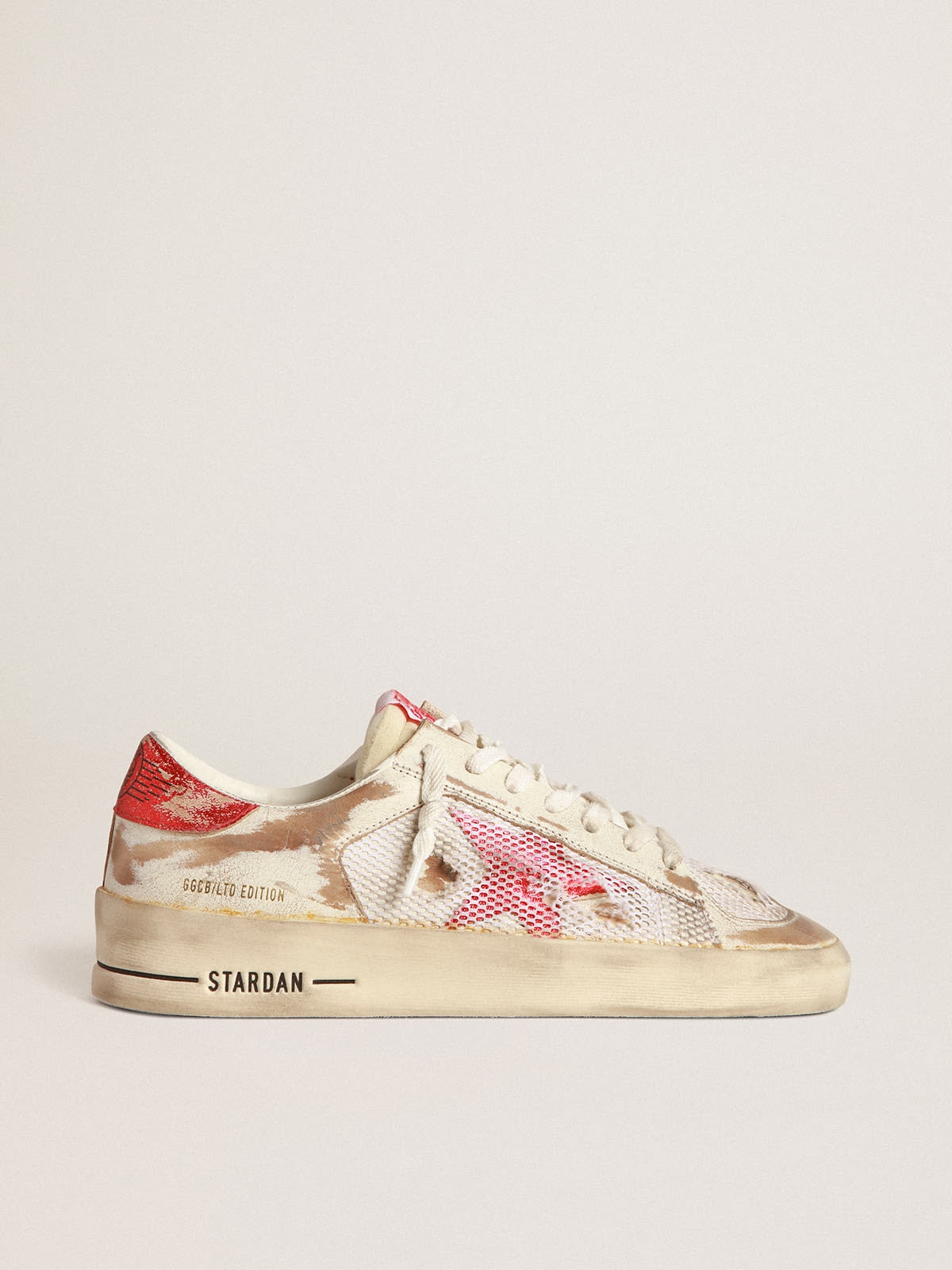 The glorious Nineties wrapped up in a sneaker. The Stardan sneakers pay homage to the basketball icons of that decade, while keeping an eye on the present. These limited edition, numbered LAB sneakers with a white leather and mesh upper feature a star and heel tab in red laminated leather. And white laces add the finishing touch. DETAILS Item No. GMF00128.F003534.10350 - White leather and mesh upper - Red laminated leather star - Red laminated leather heel tab - White leather toe - White laces - Vintage finish - Upper: 67% cow leather, 18% polyamide, 11% sheepskin leather, 4% spandex - Lining: 60% cow leather, 40% cotton - Sole: 100% rubber