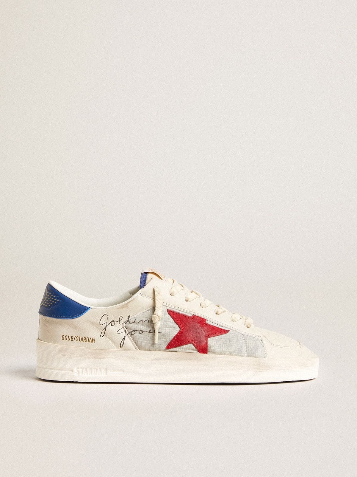 The glorious Nineties wrapped up in a sneaker. The Stardan sneakers pay homage to the basketball icons of that decade, while keeping an eye on the present. This men’s version features a red suede star and a blue heel tab on an ice-gray nylon and white leather upper. The Golden Goose signature on the upper and ivory-colored laces add the finishing touches. DETAILS Item No. GMF00333.F006177.10317 - Ice-gray nylon upper with white leather inserts - Red suede star - Blue leather heel tab - Golden Goose signature on the upper - Ivory-colored laces - Vintage finish - Upper: 72% cow leather, 28% polyamide - Lining: 41% cotton, 26% cow leather, 20% textile polyurethane, 8% polyester, 5% viscose - Sole: 100% rubber - Handmade - Made in Italy