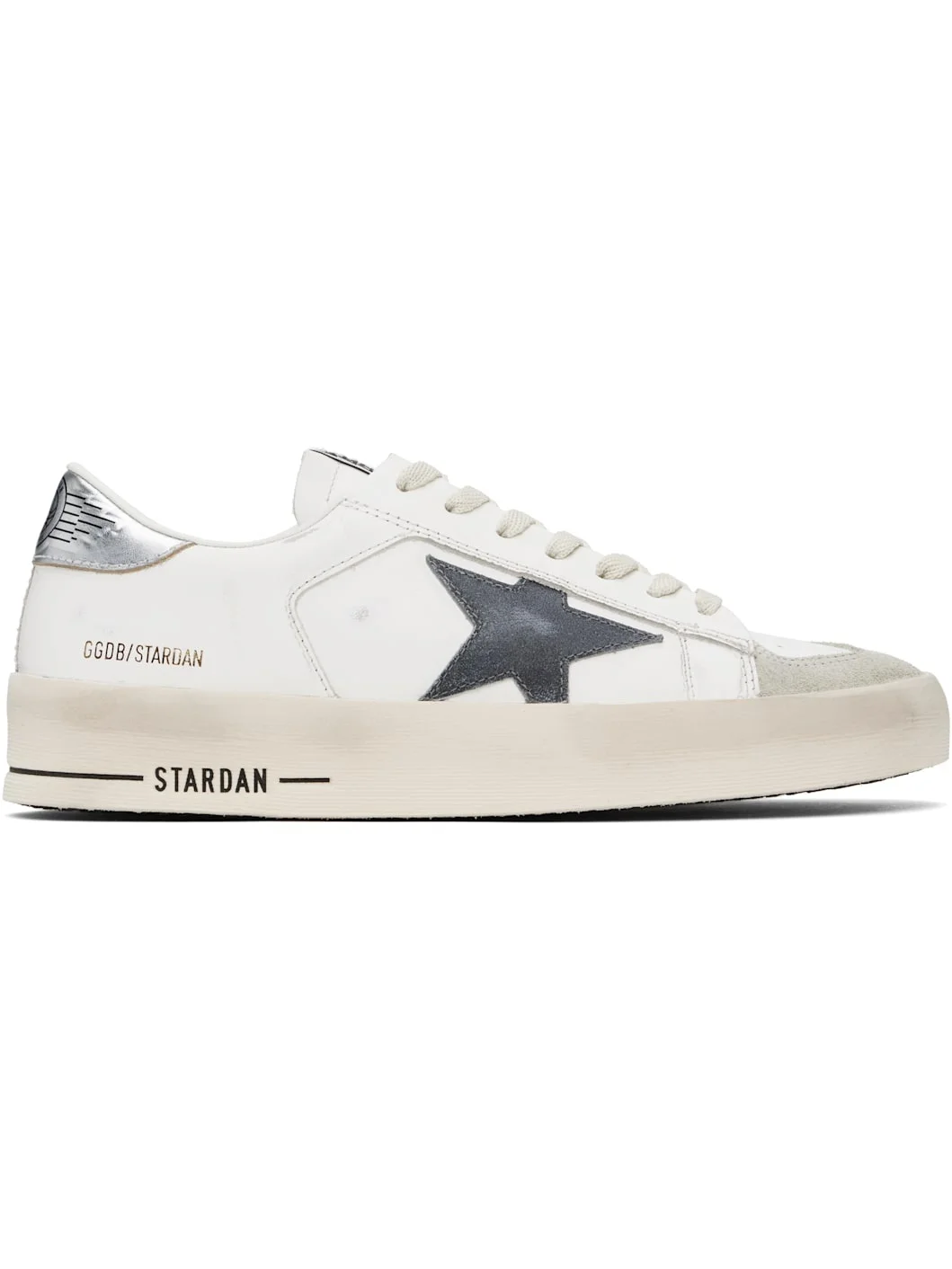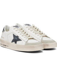 Handcrafted low-top leather sneakers in white and gray. · Smudging and distressing throughout · Perforated detailing and suede trim at toe · Lace-up closure · Logo patch at padded tongue · Padded collar · Suede signature star applique at outer side · Gold-tone logo stamp at outer side · Perforated detailing at inner side · Logo graphic printed at heel tab · Terrycloth, suede, and buffed leather lining · Logo-embossed rubber midsole · Treaded rubber sole Supplier color: White/Grey/Silver Upper: leather. Sole: rubber. Made in Italy 251264M237018