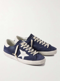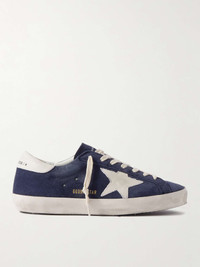There's no mistaking Golden Goose's signature 'Super-Star' sneakers - since their 2007 launch, they've become world-renowned as the brand's most iconic style. This pair is panelled from plush suede, lightly hand-distressed to mimic an authentic vintage feel and dressed with contrast leather heel tabs and the emblematic star motif. Size & Fit - Fits large to size. Take a full size smaller than normal - European sizing Details & Care - Navy suede, white leather (Cow) - Lace-up - Style number: GMF00101.F005529.50669