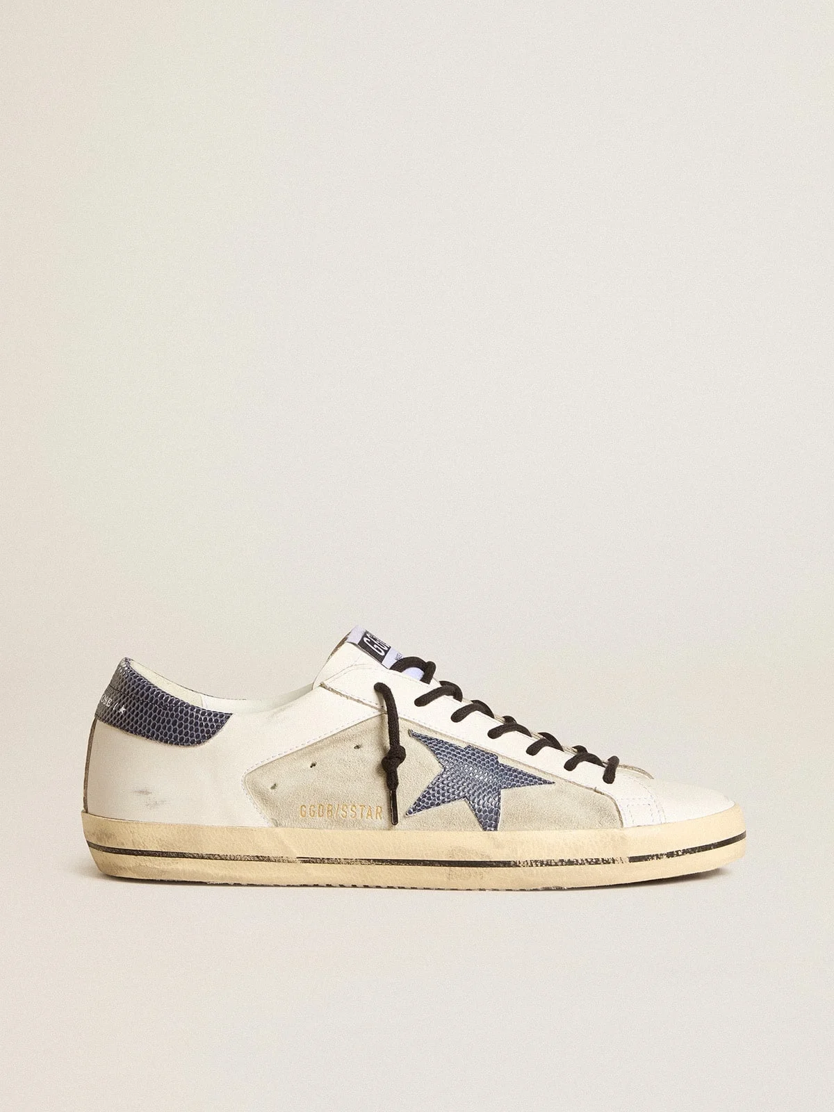 A timeless icon yet one that’s constantly evolving. At Golden, we love taking our classics and reworking them all the time, always from a new angle. These Super-Star with a white leather and ice-gray suede upper feature a star and heel tab in blue lizard-print leather. The black stripe on the foxing and black laces add the finishing touch. DETAILS Item No. GMF00103.F006040.10509 - White leather and ice-gray suede upper - Blue lizard-print leather star - Blue lizard-print leather heel tab - Black laces - Black stripe on the foxing - Vintage finish - Upper: 100% cow leather - Lining: 41% cotton, 31% cow leather, 18% textile polyurethane, 7% polyester, 3% viscose - Sole: 100% rubber - Handmade - Made in Italy
