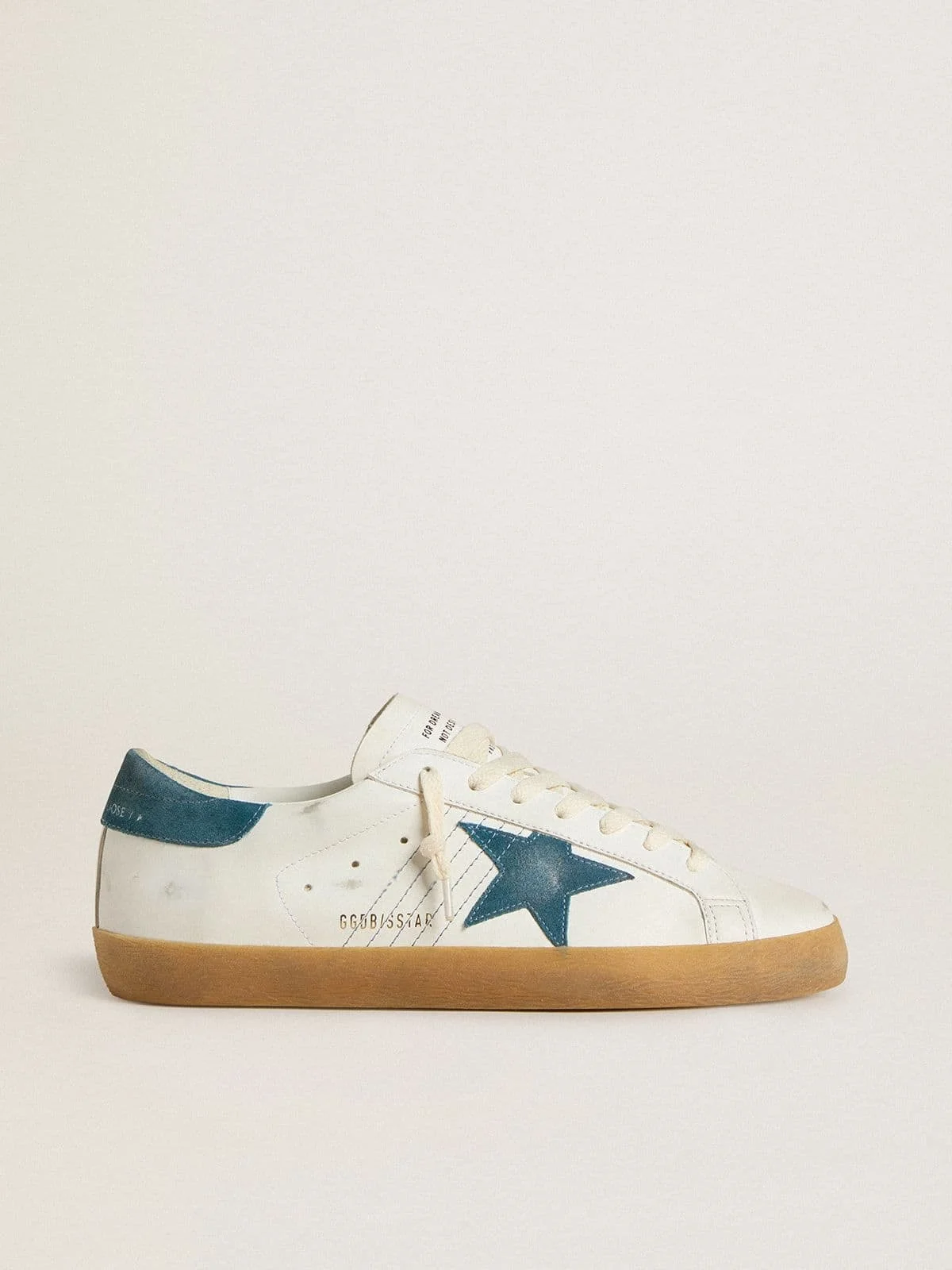 A timeless icon yet one that’s constantly evolving. At Golden, we love taking our classics and reworking them all the time, always from a new angle. These Super-Star with a white leather upper feature a petrol-blue suede star and heel tab. The petrol-blue stitching and white laces add the finishing touch. DETAILS Item No. GMF00101.F007048.12214 - White leather upper - Petrol-blue suede star - Petrol-blue suede heel tab - Petrol-blue stitching - White laces - Vintage finish - Upper: 100% cow leather - Lining: 41% cotton, 31% cow leather, 18% textile polyurethane, 6% polyester, 4% viscose - Sole: 100% rubber - Handmade - Made in Italy