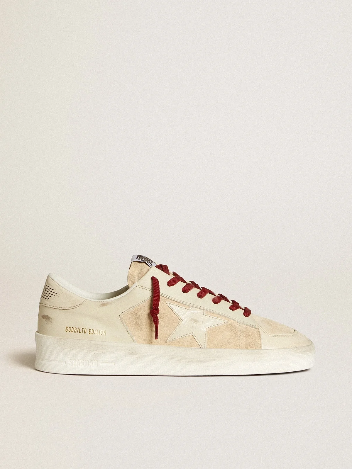 The glorious Nineties wrapped up in a sneaker. The Stardan sneakers pay homage to the basketball icons of that decade, while keeping an eye on the present. This version with an upper in pearl suede and worn white patent leather features a worn white patent leather star and heel tab. And burgundy laces add the finishing touch. DETAILS Item No. GMF00128.F006616.82833 - Upper in pearl-colored suede and worn white patent leather - Worn white patent leather star - Worn white patent leather heel tab - Burgundy laces - Vintage finish - Upper: 100% cow leather - Lining: 42% cotton, 25% cow leather, 22% textile polyurethane, 6% viscose, 5% polyester - Sole: 100% rubber - Handmade - Made in Italy