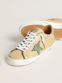 Super-Star LTD in beige leather with green suede star and silver foiled leather heel tab