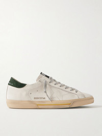 Golden Goose's 'Superstar' sneakers are stamped with a tongue-in-cheek disclaimer that says they're only intended for skateboarding, but the label will probably forgive you for using other modes of transport. Treated to look scuffed from the very first wear, this pair has been made in Italy from leather and supple suede. They're topped with black heel tabs and perforations forming the label's star. Size & Fit - Fits true to size. Take your normal size - Only available in full sizes, go up to the nearest whole size if you take a half size - European sizing Details & Care - White leather, emerald suede (Cow) - Lace-up - Style number: GMF00105.F007530