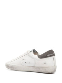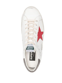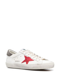 Super-Star low-top sneakers Super-Star low-top sneakers from Golden Goose featuring white, red, grey, calf leather, silver-tone hardware, perforated detailing, distressed finish, logo plaque, signature star patch to the sides, branded heel counter, logo patch at the tongue, branded insole, round toe, front lace-up fastening and flat rubber sole. Made in Italy Composition Sole: Rubber 100% Lining: Fabric 100%, Calf Leather 100% Outer: Calf Leather 100% SIZE & FIT Measurement Sole height 1 in(2.5 cm)