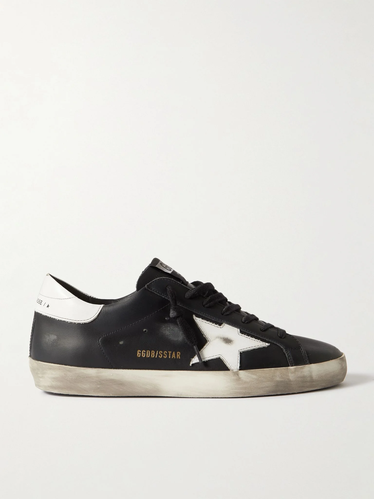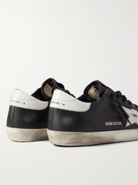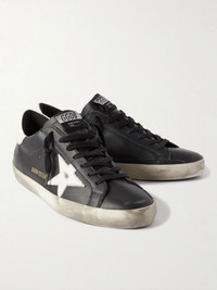 The 'Super-Star' sneakers are one of Golden Goose's most popular styles, so they're constantly issued in new materials and colourways. This black and white pair is set on rubber soles and has supple leather uppers detailed with the label's signature stars. Size & Fit - Fits true to size. Take your normal size - Only available in full sizes, go up to the nearest whole size if you take a half size - European sizing Details & Care - Black and white leather (Cow) - Designer emblems, distressed, leather linings, rubber soles - Lace-up - Style number: GMF00101.F000321.80203