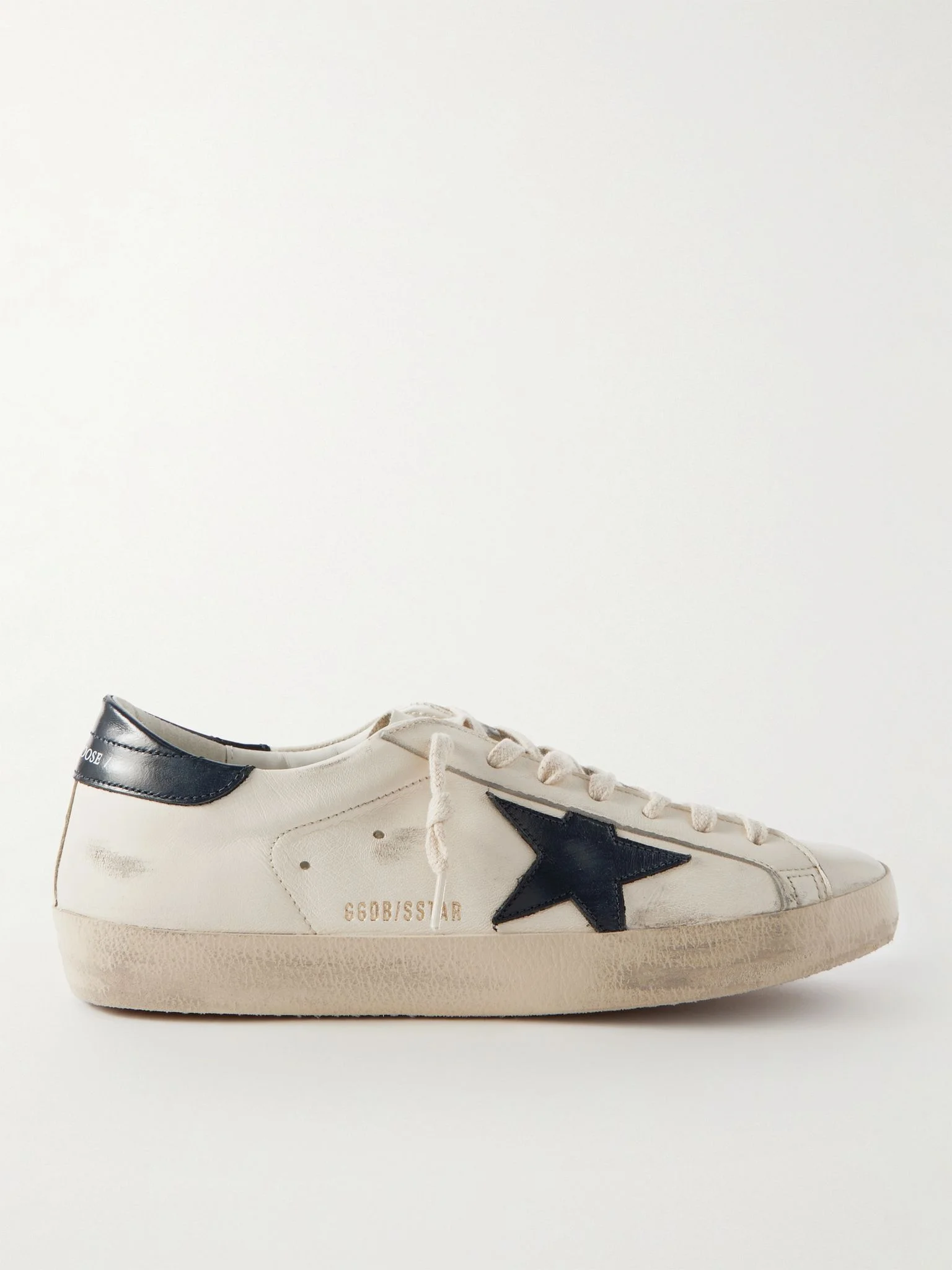 No two pairs of Golden Goose sneakers are ever the same – the distressed appearance is done by hand to create a lived-in feel. These low-profile 'Superstars' are made from leather that breaks in nicely over time and detailed with white lettering, as well as the brand's trademark star. Size & Fit - Fits true to size. Take your normal size - European sizing Details & Care - Offf-white and midnight leather (Calf) - Lace-up - Style number: GMF00101.F004164.15430