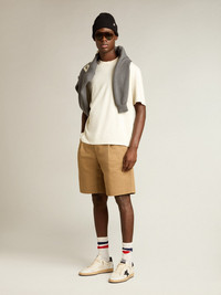 A unique, timeless collection that encapsulates the Golden Goose DNA, designed to remain with you every day, through thick and thin, come rain or shine. In aged white cotton with a distressed finish, this T-shirt with an Asian Market Exclusive fit features a raised reverse Golden logo on the back. DETAILS Item No. GUP01873.P001576.11560 - Color: aged white - Reverse Golden logo on the back - Double gold star on the back - Relaxed fit - Asian Market Exclusive - Short sleeves - Distressed finish - Main material: 100% cotton - Made in Italy The model is 183 cm tall and is wearing a size M.
