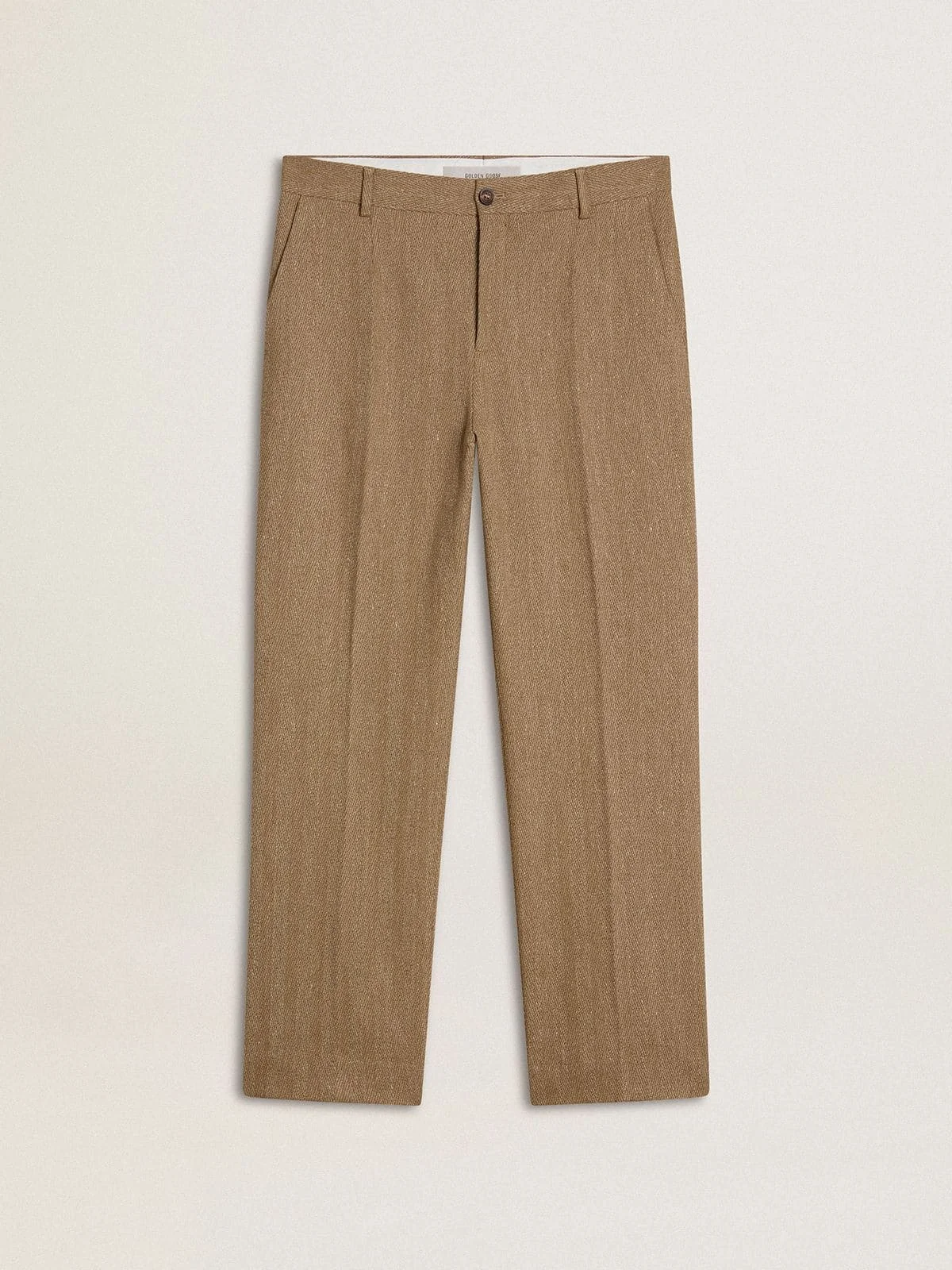Inspired by the iconic Seventies, the carefree spirit of that era comes to life with the first drop of our Fall/Winter 25 collection. These men's sand-colored tailored pants in chevron linen blend feature a loose-fit leg and four pockets. The double star on the back adds the finishing touch. DETAILS Item No. GMP01503.P002089.82971 - Journey Collection - Color: sand - Double star on the back - Loose-fit leg - Tailored fit - Four pockets - Main material: 61% linen, 38% cotton, 1% spandex - Made in Italy The model is 183 cm tall and is wearing a size 48.