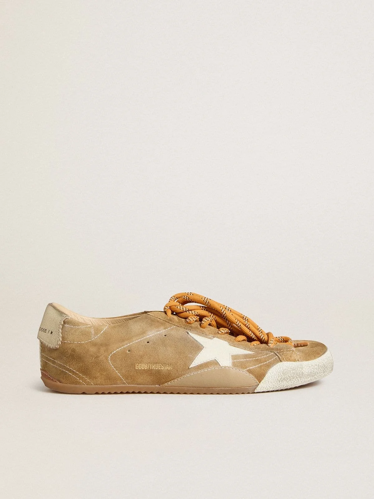 Rooted in '60s running heritage, the True-Star brings retro style and timeless performance back to the track. This men's model with a soft tobacco-colored suede upper features a white toe cap and a white leather star and insert on the back. The platinum-colored foiled leather heel tab and two-tone pink and orange hiking laces add the finishing touch. An extra double lace with which you can try new style combinations is included with this True-Star. DETAILS Item No. GMF00922.F007393.55667 - Tobacco-colored suede upper - White leather star - White leather insert on the back - Platinum metallic leather heel tab - Beige and tobacco leather inserts - 160cm two-tone pink and orange hiking laces - Extra Double Lace, both pink and orange, 160 cm, inside the package - Contrast stitching - Internal and external patch for protection and support - Regular toe cap pressed to make the toe slightly square - White vintage-effect dusting - Lived-in finish - Upper: 100% cow leather - Lining: 41% cotton, 31% cow leather, 19% sheepskin leather, 6% polyester, 3% textile polyurethane - Sole: 100% rubber - Handmade - Made in Italy