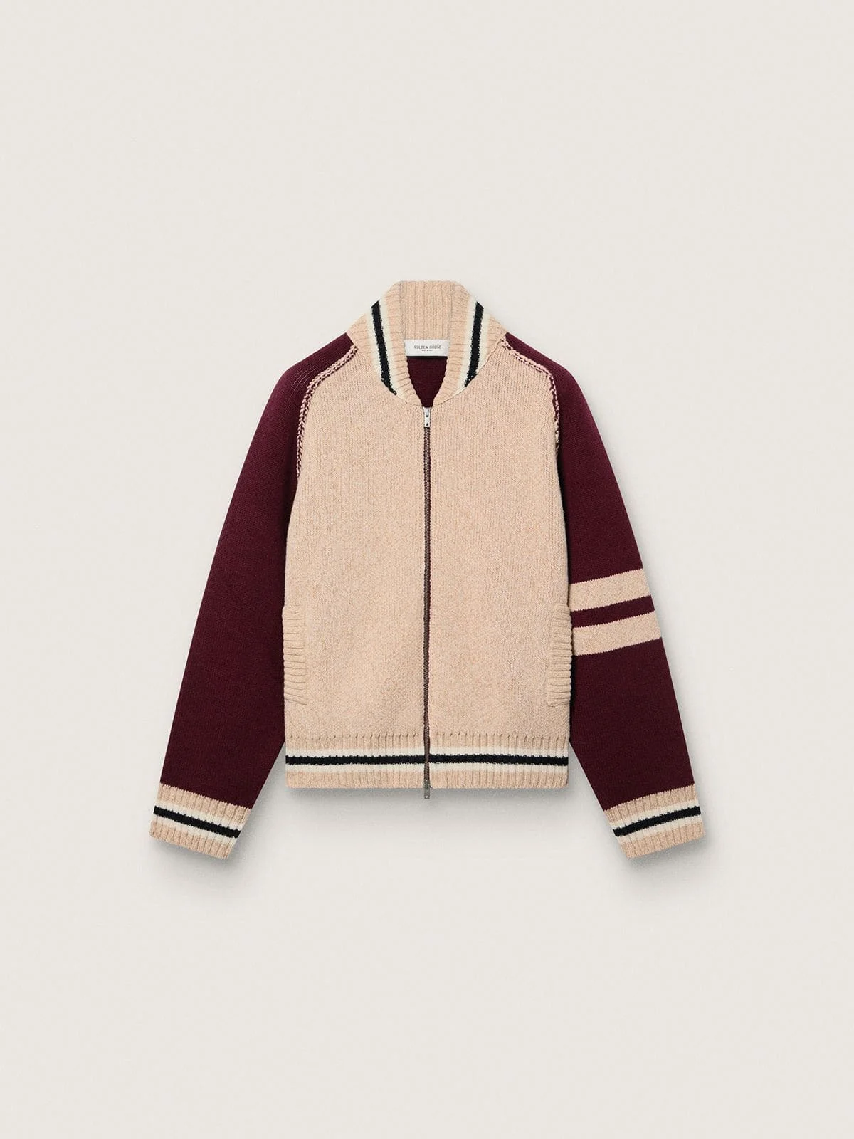 Our Holiday Collection is a celebration of woven textures and sharp tailoring, blending with soft knits, velvet whispers, archive florals, and satin that catches the light just right. A statement piece in a retro style: this unisex bomber jacket with a regular fit is made of wool-blend yarn in shades of white and burgundy. The jacquard design features the number '78' in burgundy on the back, two-tone stitching on the front and back, and a front zip closure. The ribbed edges with contrasting black and white stripes and the iconic double star on the back complete the look. DETAILS Item No. GUP02583.P002401.15880 - Journey Collection - Color: white and burgundy - Unisex bomber jacket - Regular fit - Raglan sleeves - Ribbed edges with contrasting black and white stripes - Jacquard knit with number '78' on the back - Two-tone chain stitching - Zip fastening - Double star on the back - Main material: 75% virgin wool, 10% cotton, 10% polyamide, 5% cashmere - Made in Italy The model is 183 cm tall and is wearing a size M.