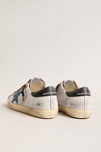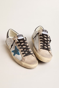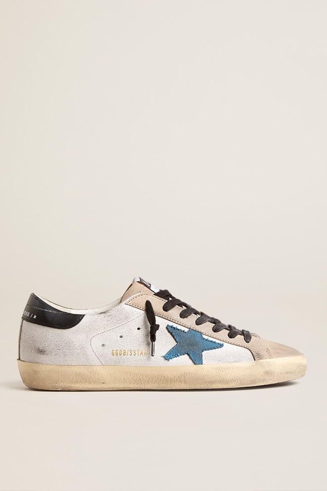 A timeless icon yet one that’s constantly evolving. At Golden, we love taking our classics and reworking them all the time, always from a new angle. With a white upper, these men's Super-Star feature a light blue canvas star, black leather heel tab, and beige suede tongue. The beige suede inserts and black laces add the finishing touch. DETAILS Item No. GMF00101.F006228.82723 - Color: white - Light blue canvas star - Black leather heel tab - Beige suede tongue - Beige suede inserts - Black laces - Vintage finish - Upper: 97% cow leather, 3% cotton - Lining: 41% cotton, 31% cow leather, 18% textile polyurethane, 6% polyester, 4% viscose - Sole: 100% rubber - Handmade - Made in Italy