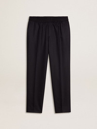 The third drop in our Fall/Winter 25 collection channels the funky glamor of the 1970s, a time when the night transformed into a canvas for unapologetic self-expression. These men's pants in navy blue wool with an elasticated waist feature a tailored fit with thin stripes. The loose leg and double star on the back add the finishing touch. DETAILS Item No. GMP00581.P002098.50629 - Journey Collection - Color: navy blue - Loose-fit leg - Elasticated waistband - Tailored fit - Thin stripes - Main material: 99% virgin wool, 1% cotton - Made in Italy The model is 183 cm tall and is wearing a size 48.
