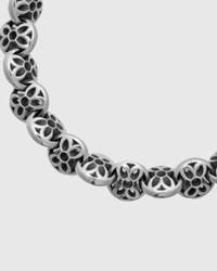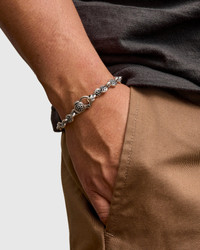 The Boston Link Party Bracelet features the brands "tea cake" motif and model 9 clasp to secure the chain. Me tals are mixed, cast, soldered, cut, tested and assembled at the brands Los Angeles Foundry allowing the brand it's signature eye for detail. Decorated with a single noodle end-link with each piece undergoing a sulphuric acid and hand-burnishing process, imparting a blackened contrast to the polished sterling silver. - Size AA chain - Chain individually linked and welded - Model 9 locking clasp - Noodle end link - Good Art logo on clasp - .925 Sterling Silver - Made at the Good Art HLYWD Foundry in Los Angeles, CA To determine your size, measure your wrist with flexible measuring tape snugly around the lower portion of your wrist. 17 cm = 8 1/8", end to end. Email us at service@blueowl.us with any questions.