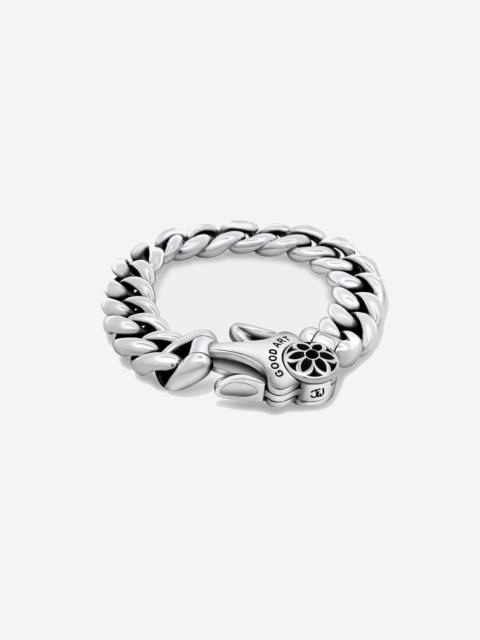 Handmade at the foundry in Los Angeles, this is a lighter-weight, elegant incarnation of GOOD ART HLYWD’s iconic Model 10 clasp and chain. Crafted from solid .925 sterling silver, the flattened oval links are individually welded together, creating a solid, flowing band that lays flat against the wrist. The unique pincer-style closing mechanism securely marries the bracelet together, finished with the brand’s distinctive rosette. As with all GAH jewellery, the chain and clasp are dipped in sulfuric acid and hand-burnished to create a subtle blackened contrast against the impeccably polished highlights. Made by GOOD ART HLYWD Handmade jewellery from the USA, designed by Josh Warner and crafted at The Foundry in Los Angeles. GOOD ART HLYWD Model 10 Bracelet Size 4A - Sterling Silver - .925 Sterling Silver - Size AAAA - Link width: 9mm - Clasp length: 24mm