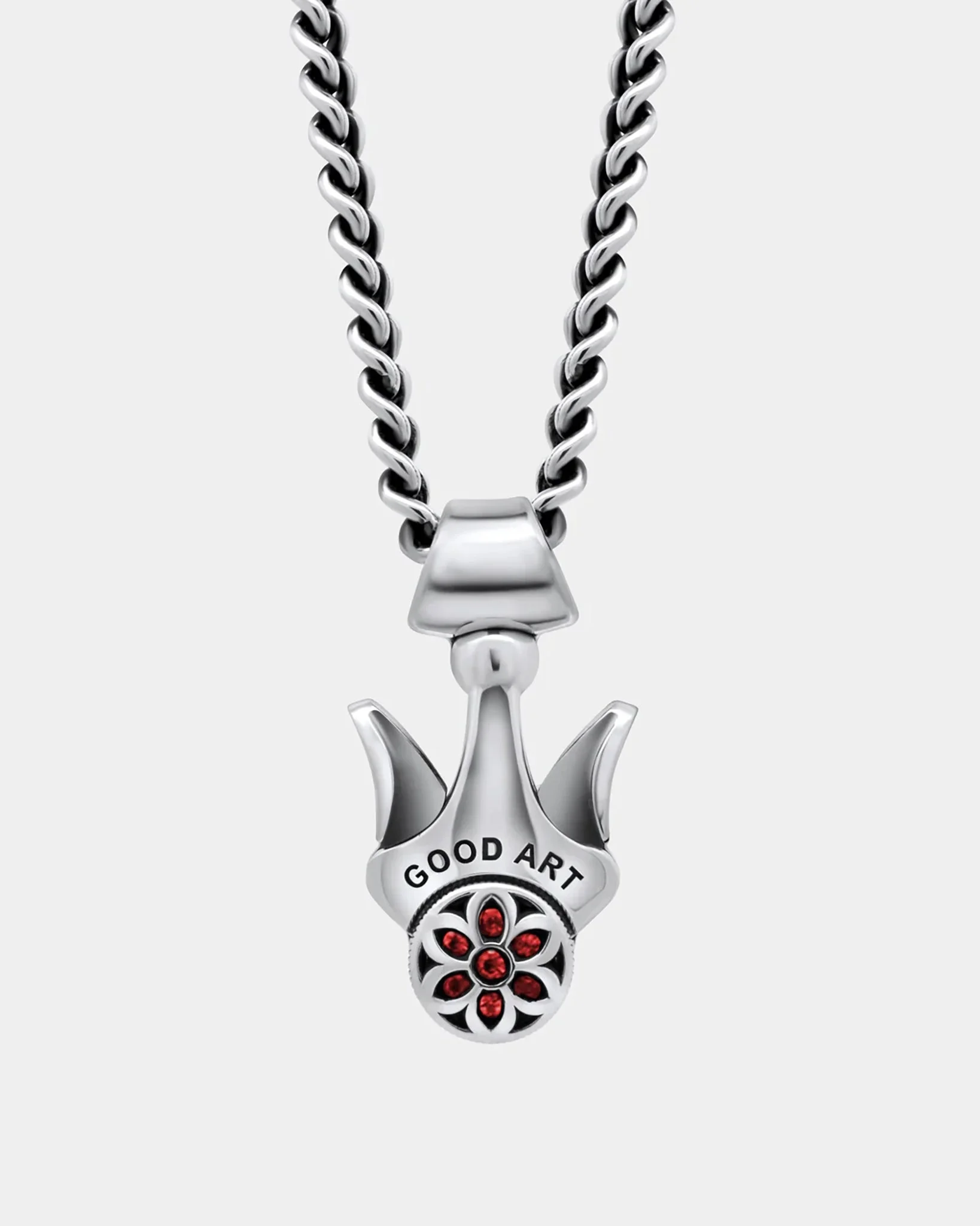 Level up your Model 10 pendant with the Sapphire pave GOOD ART HLYWD 'buttons'. The clasp on the Model 10 pendant can be opened to switch the button in and out. Made by GOOD ART HLYWD Handmade jewellery from the USA, designed by Josh Warner and crafted at The Foundry in Los Angeles. GOOD ART HLYWD Model 10 Button - Sterling Silver with Rubies - .925 sterling silver - Ruby pave rosette - Compatible with Model 10 pendant