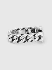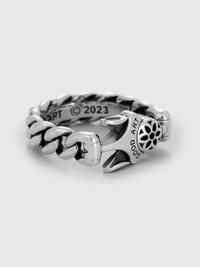 The Model 10 Ring celebrates the brand's signature Model 10 design. The rosette has been with Good Art HLYWD since even before the brand's onset, when founder Josh Warner began drawing the floral motif after being inspired by iconography found on tombstones in the United Kingdom. The ring features the iconic central rosette with pincer jaw, and a rigid cuban chain design body. - Model 10 design - Good Art branding on inner face - .925 Sterling Silver - Made at the Good Art HLYWD Foundry in Los Angeles, CA - Includes Bill of Authenticity Sizing is standard US sizing