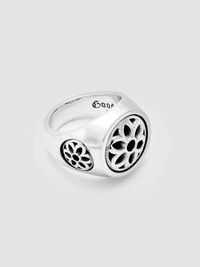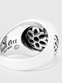 The Club Ring is a signature design from Good Art HLWYD centered around the brand's iconic rosette symbol and forged from five separate pieces, each individually cast and finished. The rosette has been with Good Art HLYWD since even before the brand's onset, when founder Josh Warner began drawing the floral motif after being inspired by iconography found on tombstones in the United Kingdom. The ring features a large central rosette, and is flanked by three outer rosettes set into the body, with a final fourth rosette hidden on the underside. - 5-piece construction with hidden inner rosette - Good Art branding on inner face - .925 Sterling Silver - Made at the Good Art HLYWD Foundry in Los Angeles, CA - Includes Bill of Authenticity Sizing is standard US sizing